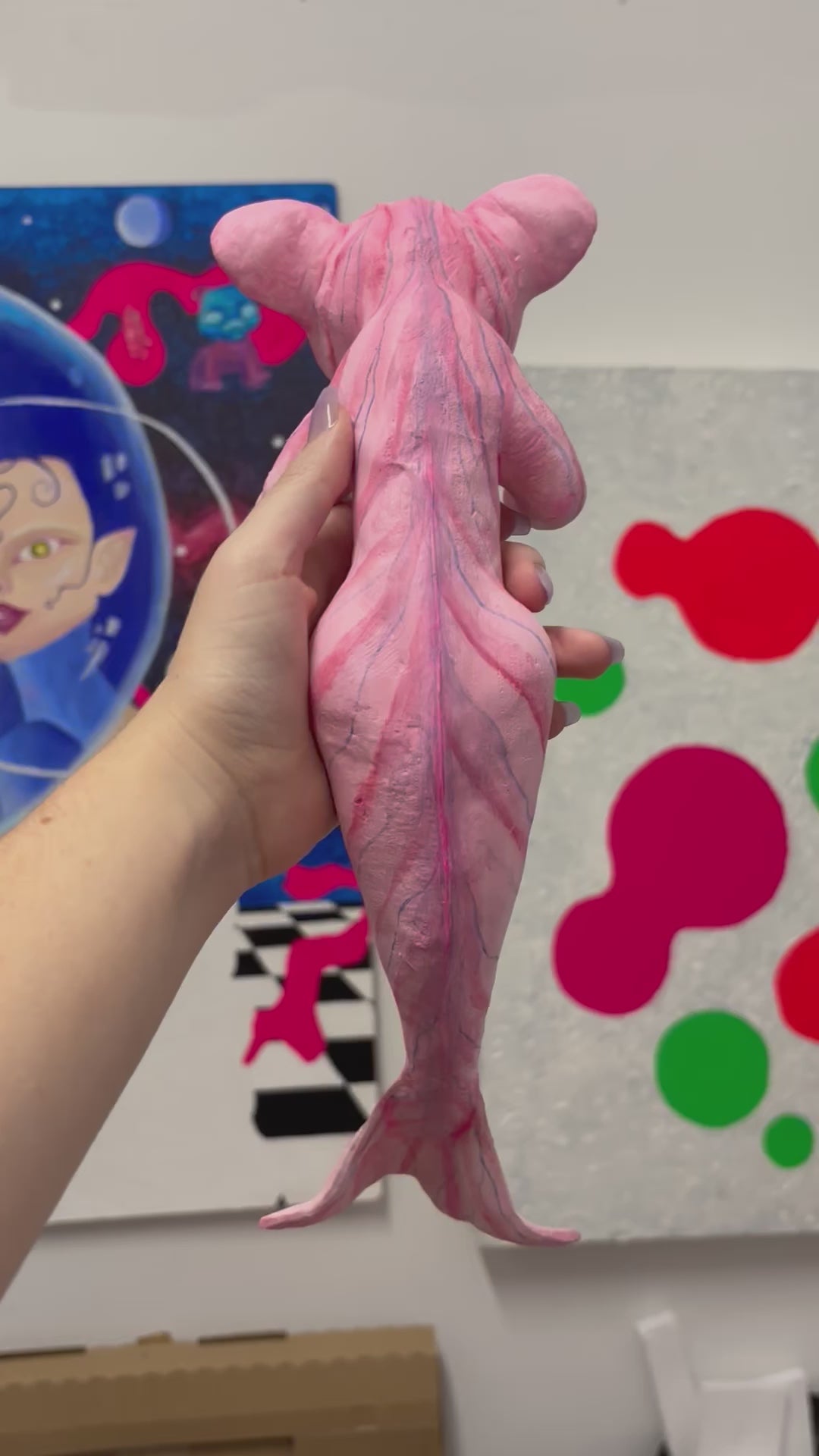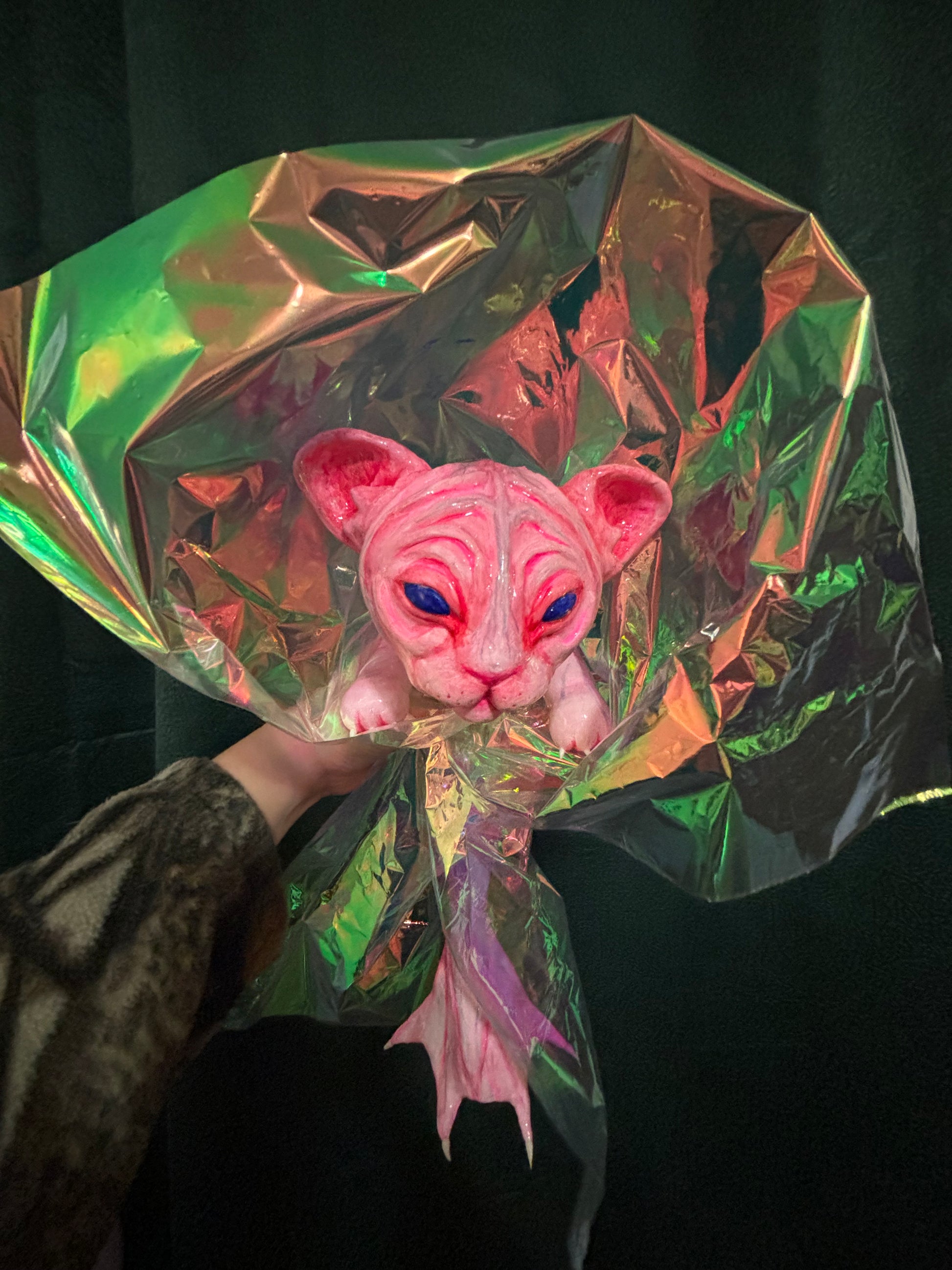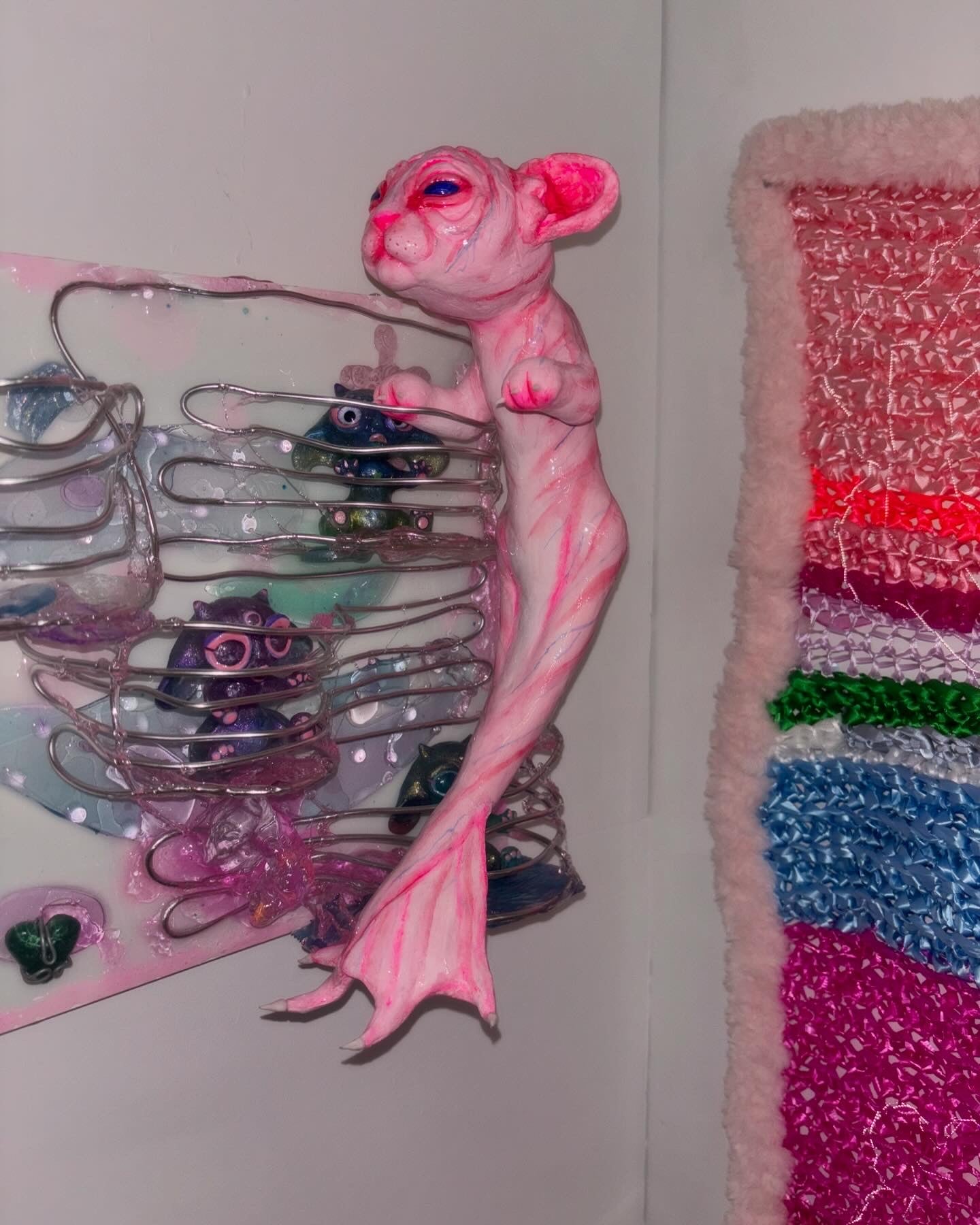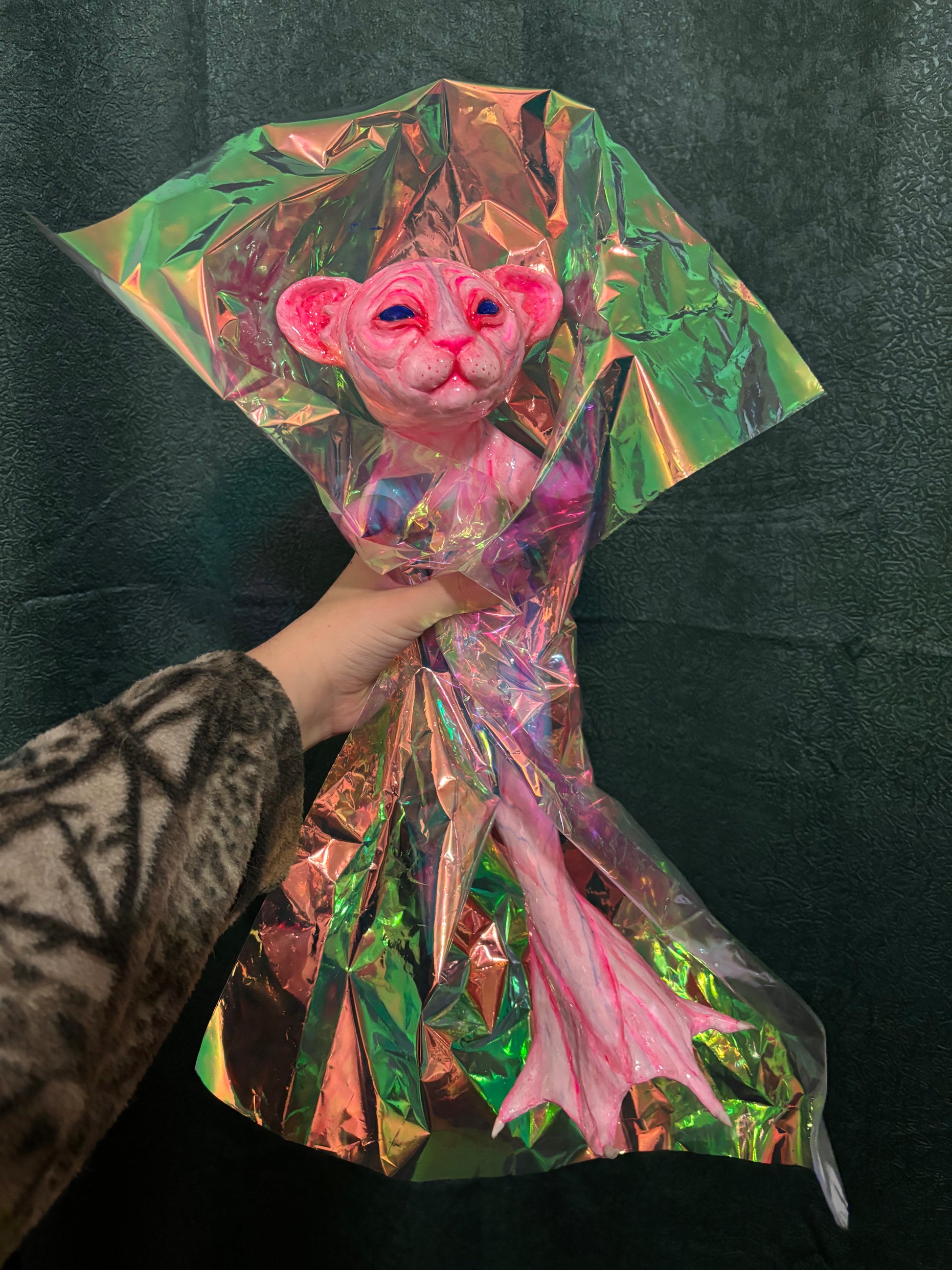A one of a kind lightweight hand painted sculpture of a baby mer-cat /catfish for you to accessorize only the best outfits! The piece is made of aluminum wire skeleton, foam clay structure, acrylic paint and resin coating.