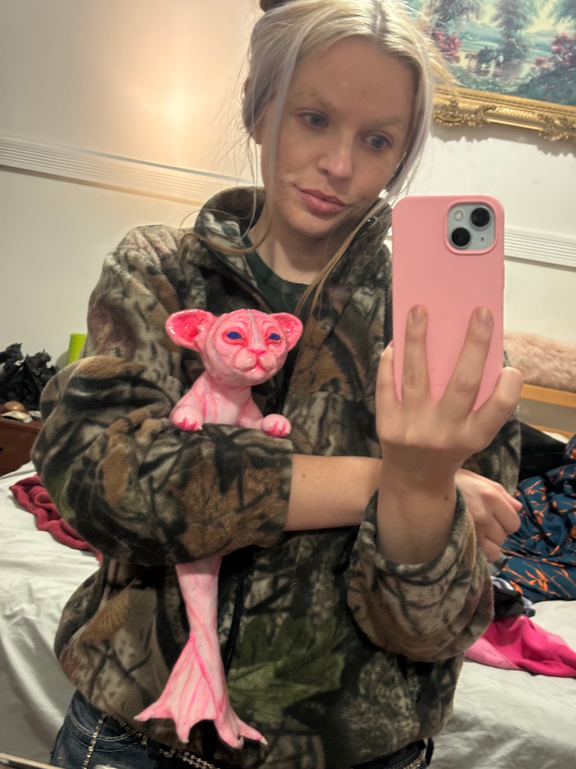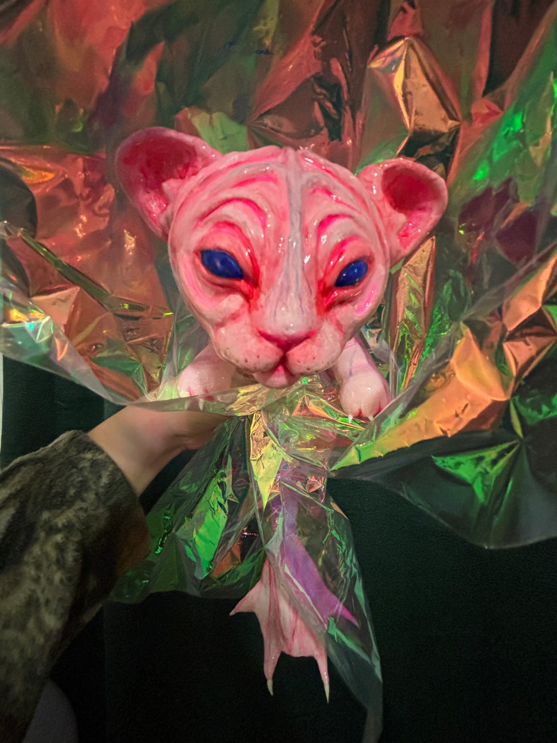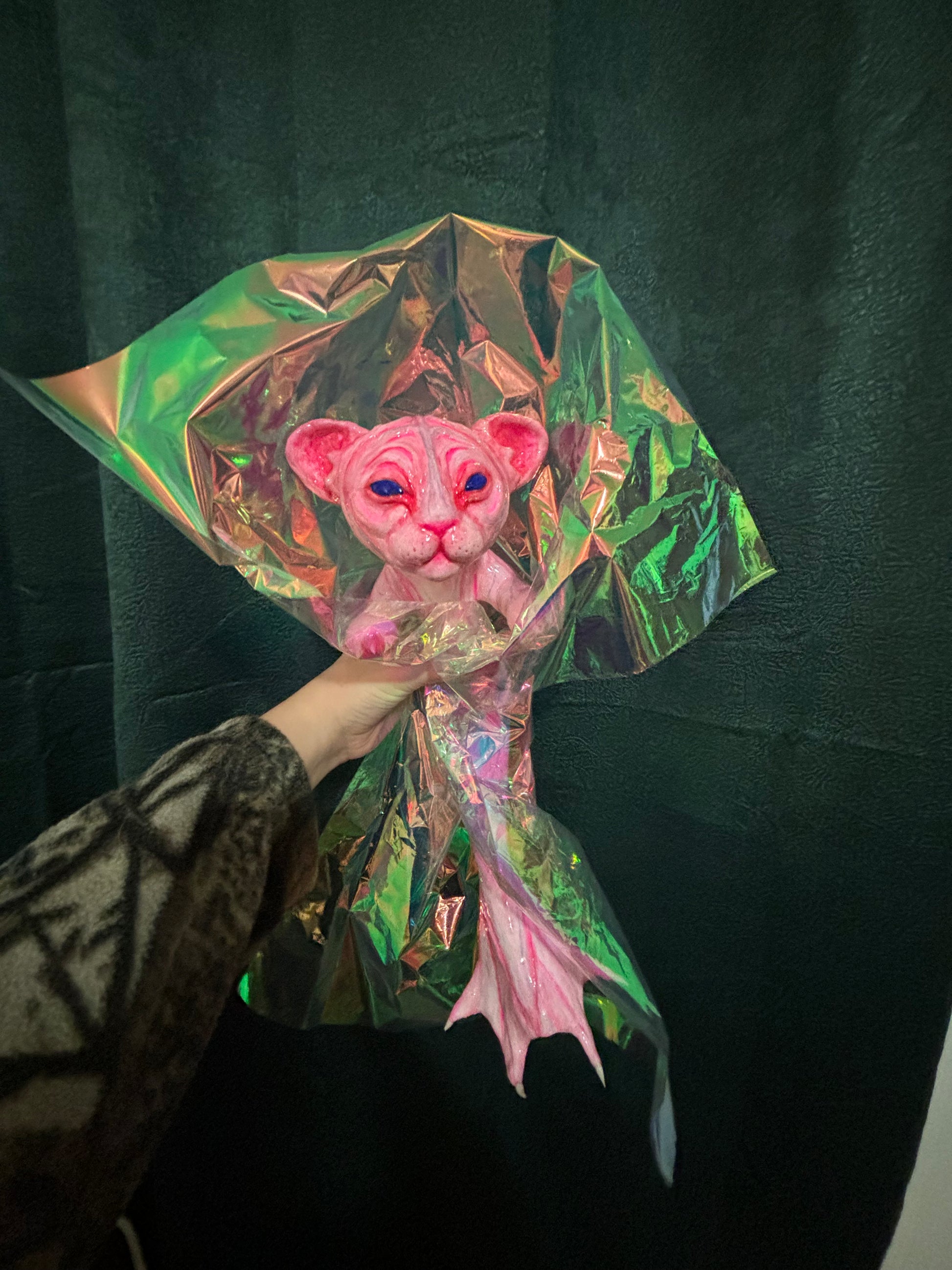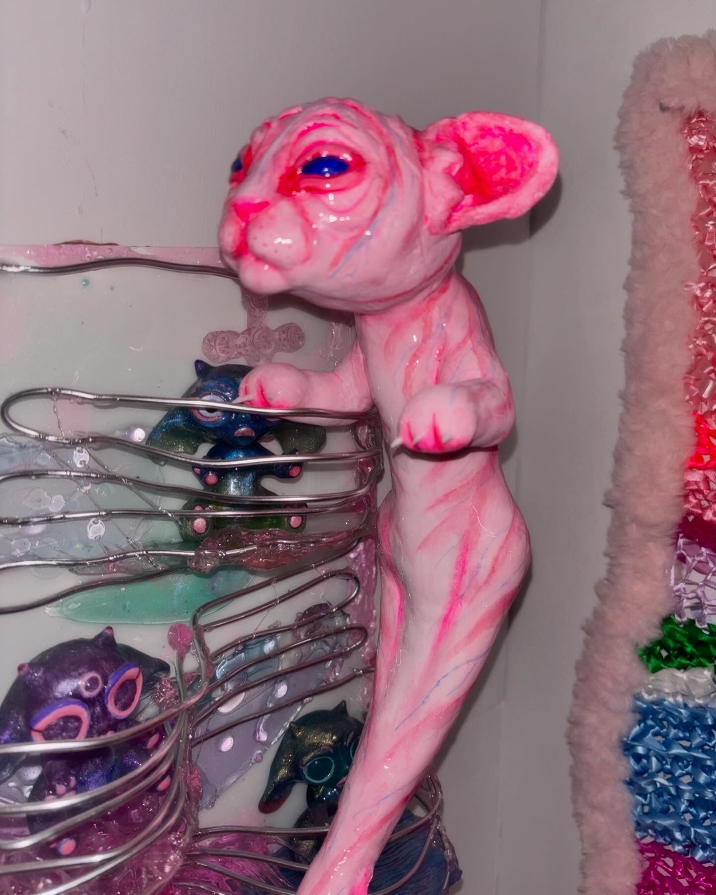 A one of a kind lightweight hand painted sculpture of a baby mer-cat /catfish for you to accessorize only the best outfits! The piece is made of aluminum wire skeleton, foam clay structure, acrylic paint and resin coating.