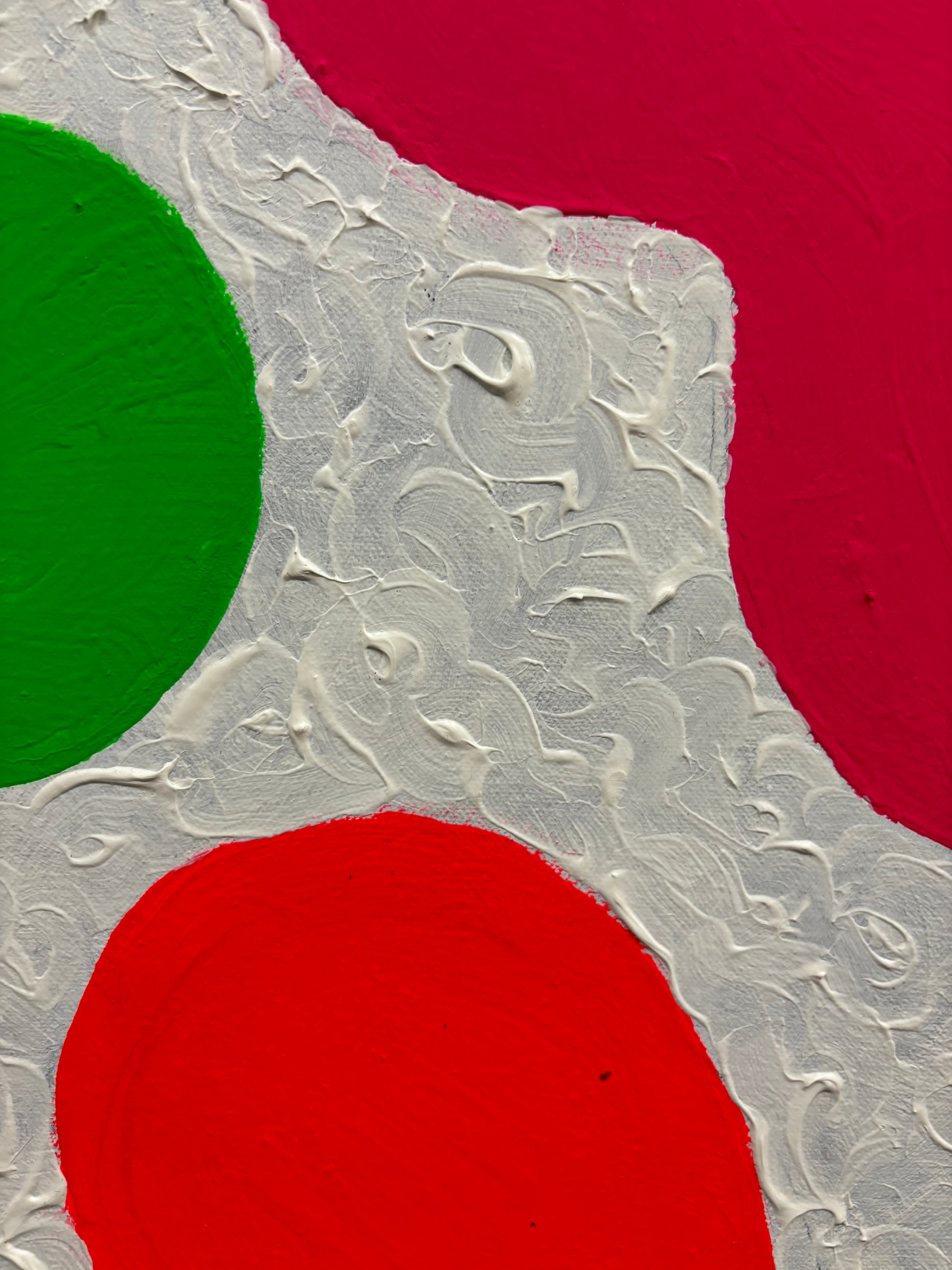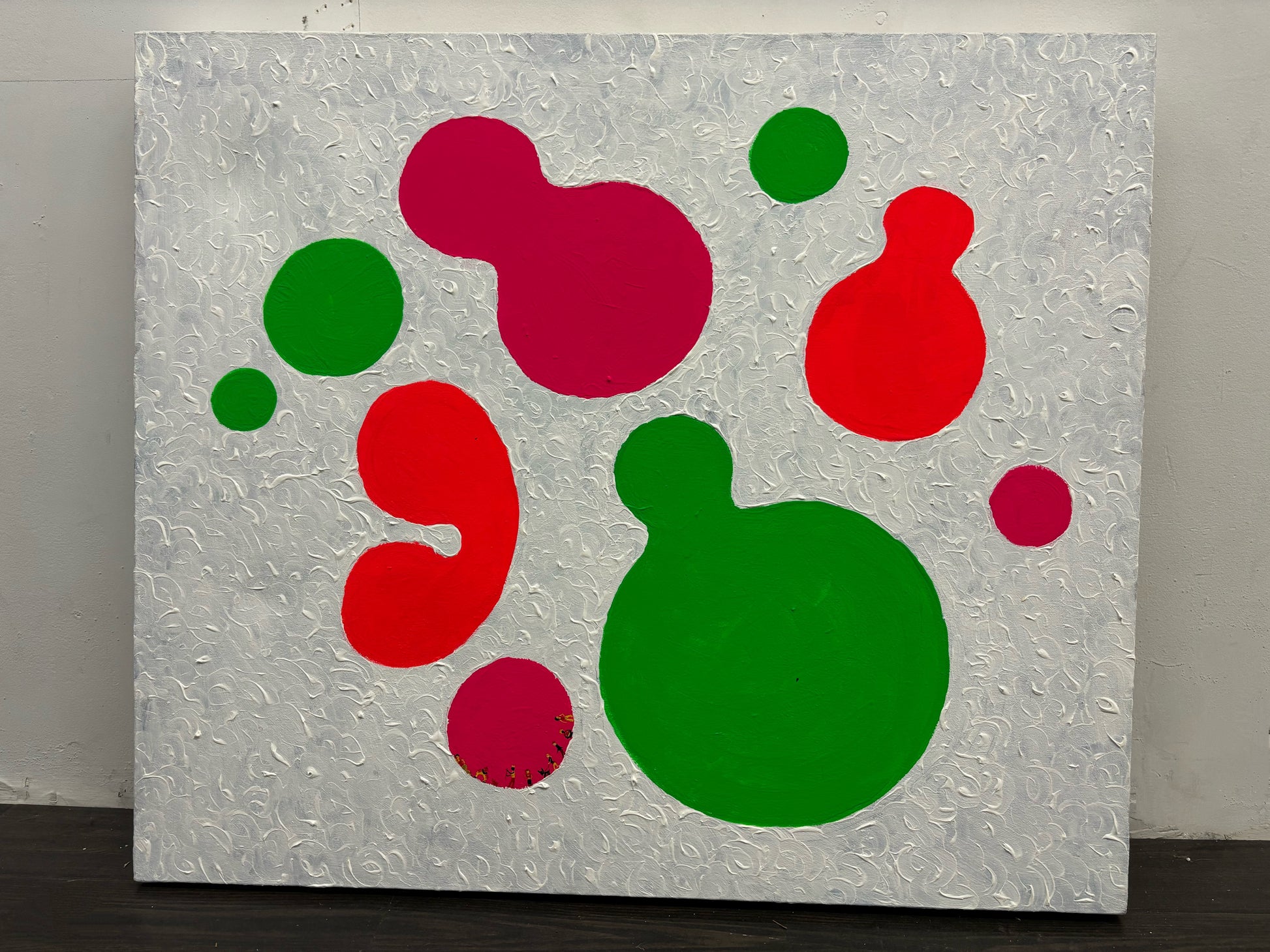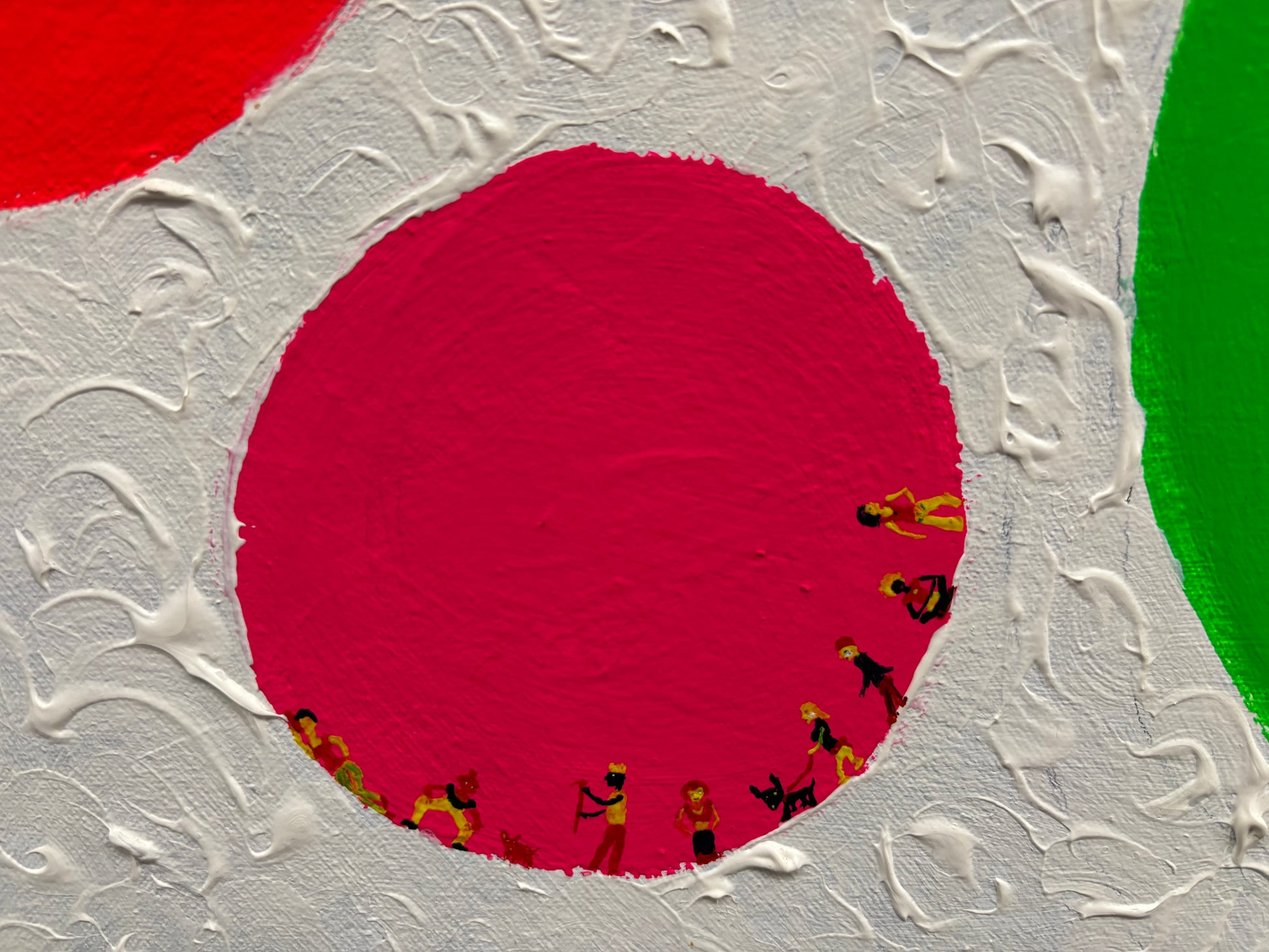 Explore the wonders of the multiverse from the comfort of your home and some meditation on this painting. This playful piece depicts tiny people and animals living in one of the colorful bubbles on a textured white backdrop inspired by yayoi kusama. Let your imagination run wild with this quirky piece, inspired by the theory of bubble multiverse.