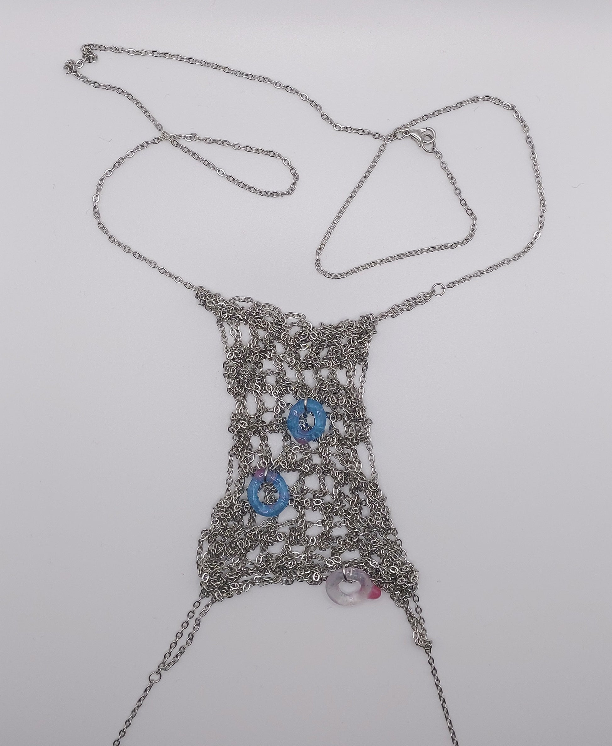 This piece is a ~3x2 inch chain mail rectangle. Optionally there are three dripping jelly rings woven into the chain mail in random spots.