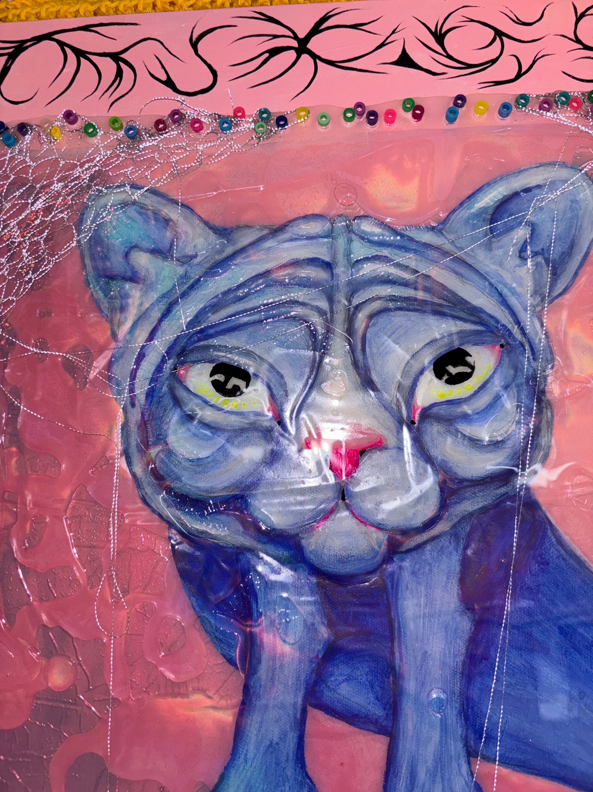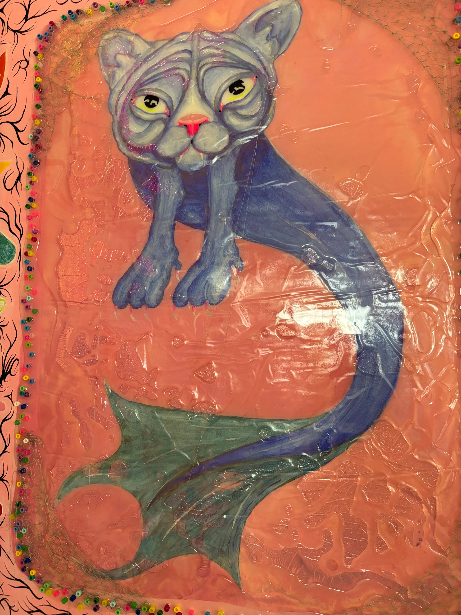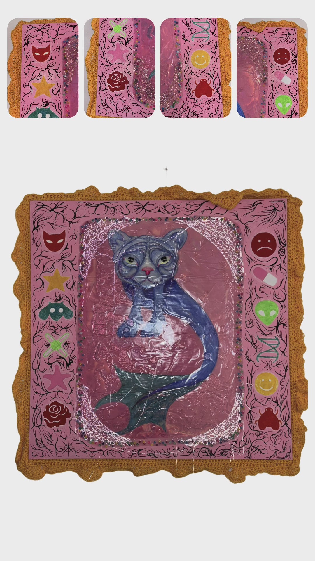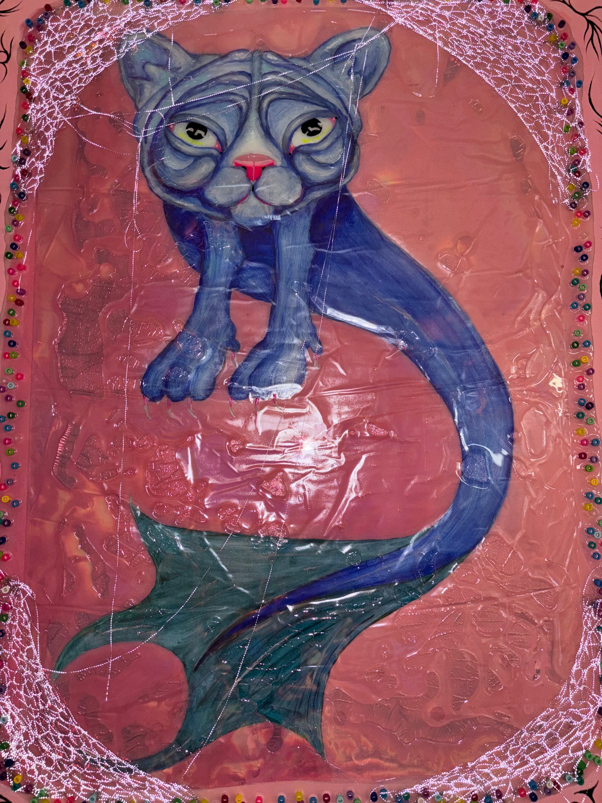 Somewhere between worlds this pool of water sits on your wall surrounded with reflective fishing threads and colorful tops of old piers. Strange symbols remain among black thorns from some forgotten society.