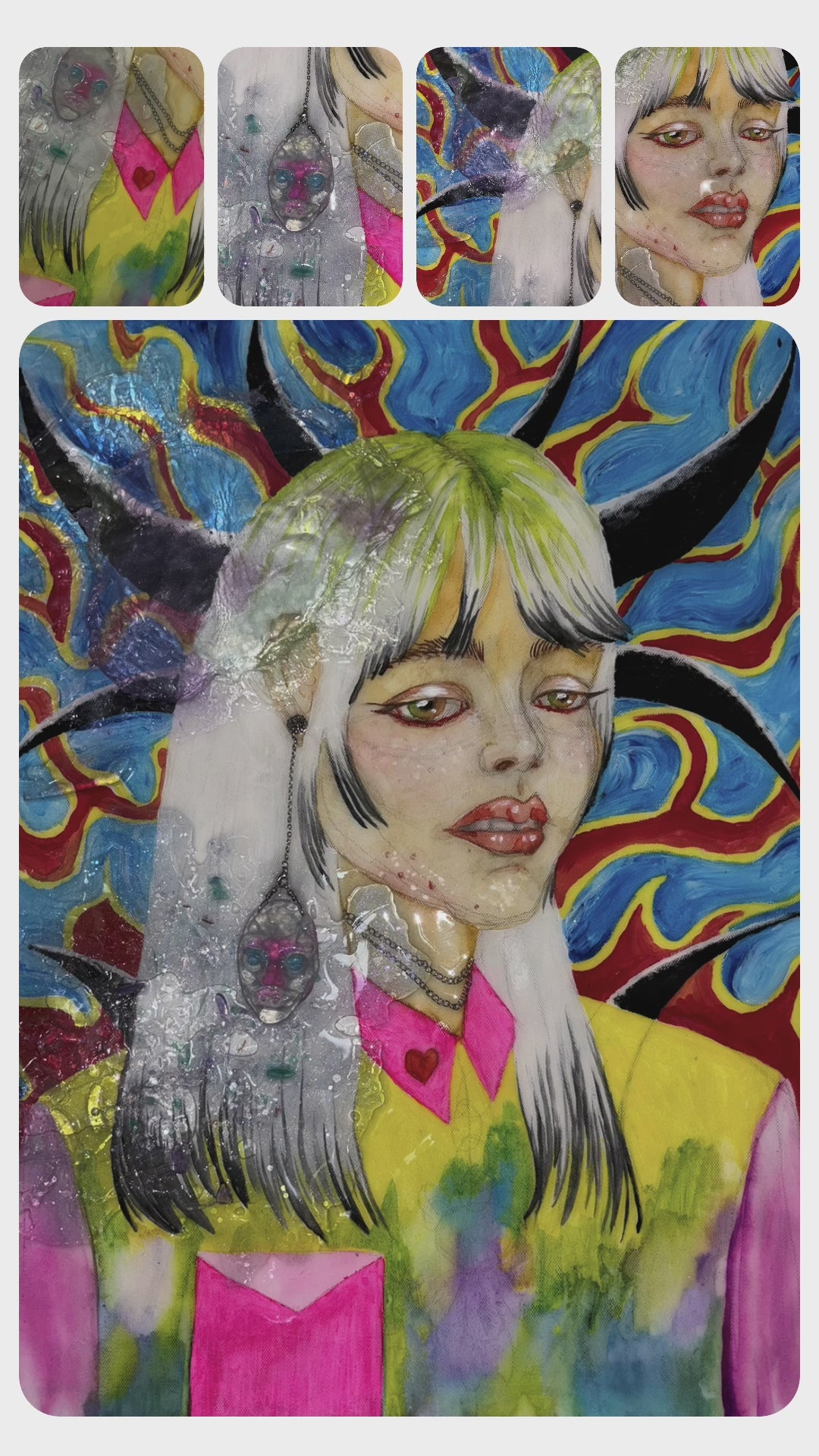 Inspired by current pop idols and musicians, this piece is a celebration of women’s success. Her earring is a vampire death mask hinting at the blood sucking industry that’s falling apart and dying.