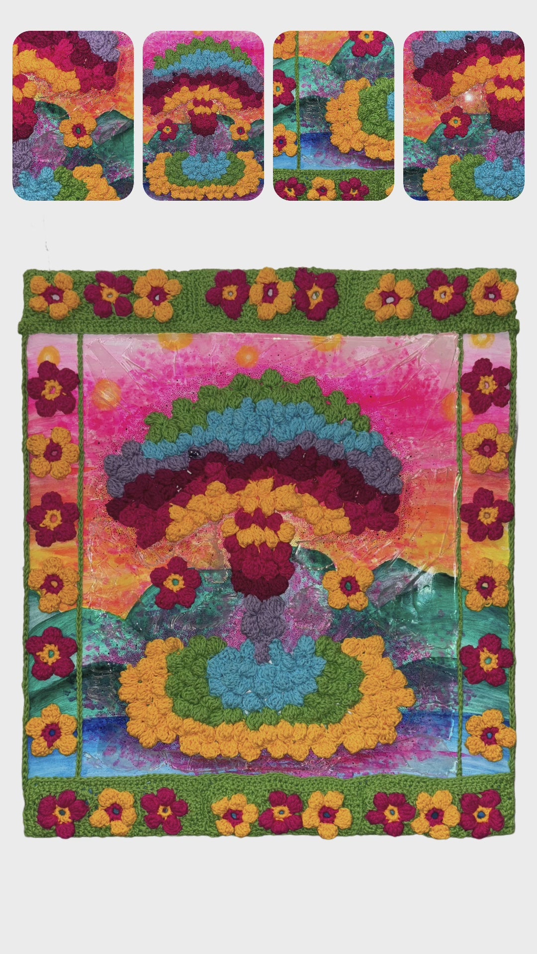 The piece is made of acrylic, crocheted cotton yarn, and resin on compressed wood.